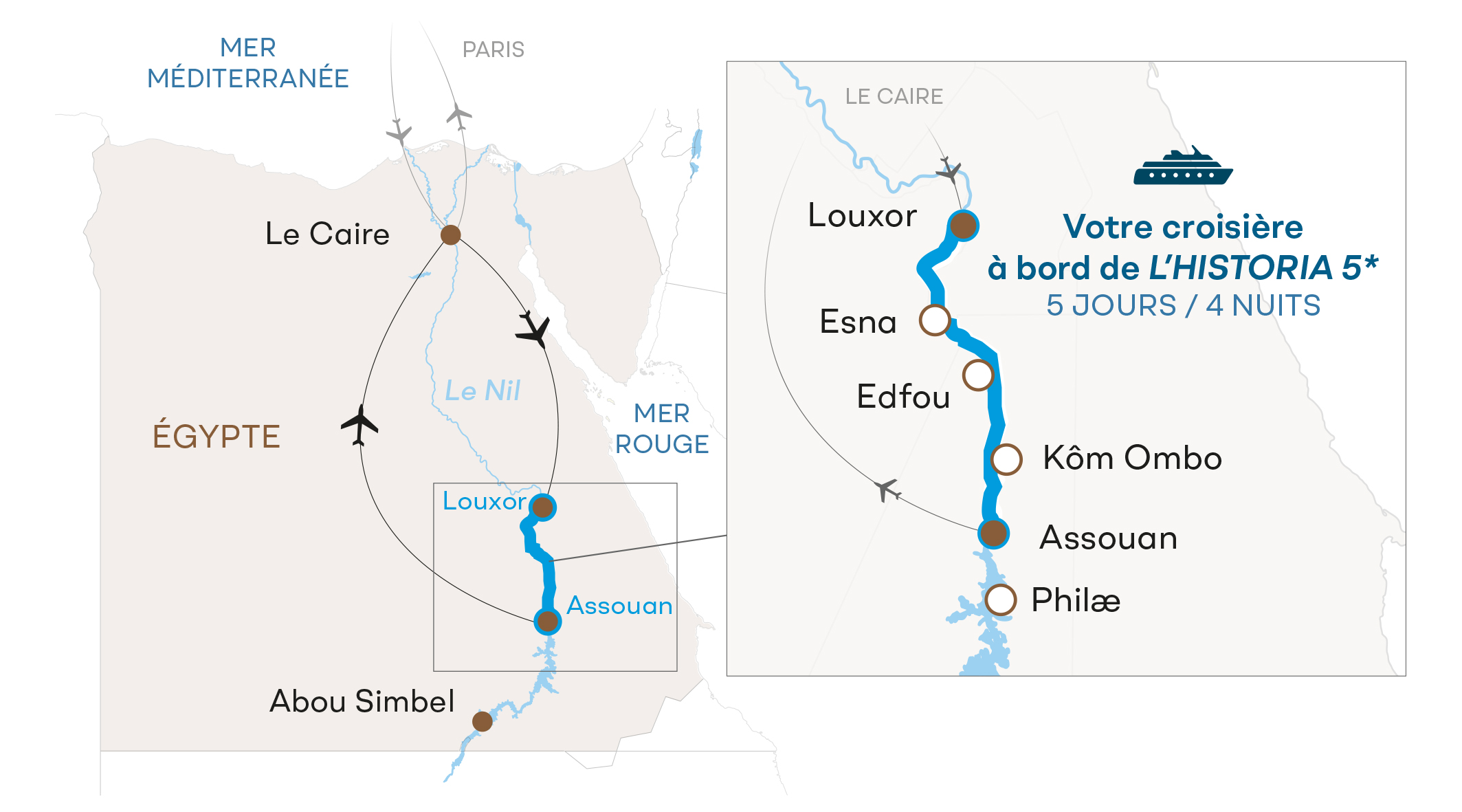 Bienvenue à bord de votre navire l’Historia L’Historia vous invite à remonter l’Histoire et le Nil tel Pharaon… Ce palace flottant vous a été entièrement réservé par TMR. Navire-Boutique-Hôtel, lancé en 2021, il s’impose comme la référence du fleuve. Salons, bars, restaurant, Spa, bibliothèque, boutique… coiffé d’un immense pont-terrasse 100 % panoramique avec une fabuleuse piscine, ce nouveau vaisseau s’appuie sur l’imagerie de l’Égypte éternelle. Il vous offre des conditions de voyage encore jamais vues. Toutes vastes et extérieures, les luxueuses 50 cabines et suites jouissent d’une vue panoramique révélant toute la beauté du Nil. Elles bénéficient de tous les équipements les plus modernes : rangements, mini bar, machine à café, coffre-fort, télévision, climatisation réglable, sèche-cheveux, baignoire ou douche, ainsi que de la connexion Wi-Fi… L’idéal pour naviguer au fil des chefs-d’œuvre de l’Humanité. TMR renoue ainsi avec l’âge d’or des voyages et vous guide sur le plus long fleuve du monde.