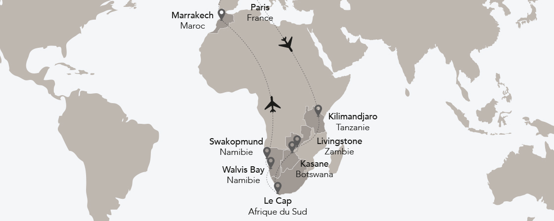 Il y a plus de 12 ans maintenant, TMR commençait son exploration de l’Afrique, du Nord au Sud. Souvent programmées lors des Tours du Monde, nos escales africaines ont séduit par leur originalité, leur virginité et leur authenticité. Nos « 8 Travellings Sud-Africains » et « 2 Zambezi Queen » ont pu vous offrir un autre regard sur l’Afrique… en train et yacht de luxe.