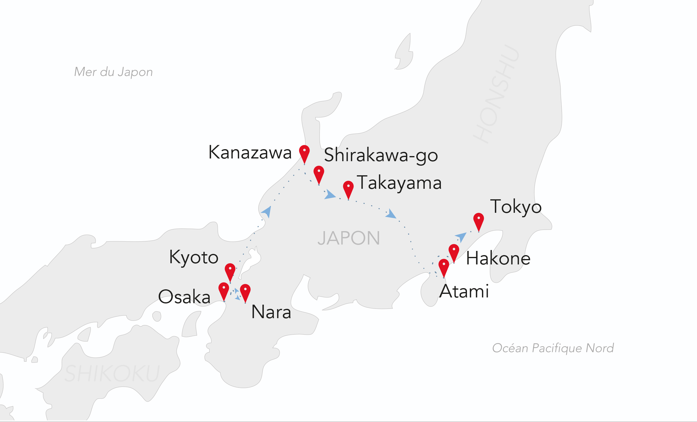 Notre itinéraire conçu dans l’esprit d’un ailleurs d’hier et de demain vous fera découvrir Osaka, cité des affaires ; Kyoto, l’âme du pays avec ses 1.650 temples bouddhistes et ses 400 sanctuaires shintoïstes ; les alpes japonaises de Kanazawa à Takayama. Une région authentique plus secrète, magnifique par son écrin naturel, ses jardins paysagés, son architecture typique et ses résidences de samouraïs ; le Mont Fuji, sommet du japon ; et enfin Tokyo, capitale bouillonnante et spectaculaire.